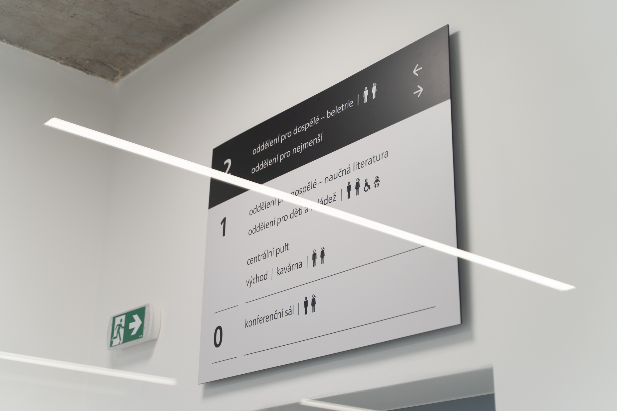 Pro veřejnou knihovnu v Chodově jsme navrhli komplexní orientační systém, který propojuje architekturu budovy, grafický design a každodenní potřeby návštěvníků. Řešení stojí na jasné hierarchii informací a srozumitelné navigaci napříč interiérem. Důraz jsme kladli na čitelnost, dlouhodobou udržitelnost a vizuální soudržnost se stávající identitou knihovny, aby se návštěvníci mohli v prostoru intuitivně pohybovat bez pomoci personálu.